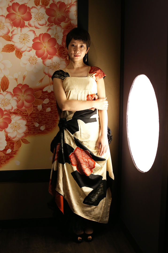 着物を裁断せずに、ドレスとして仕上げます。